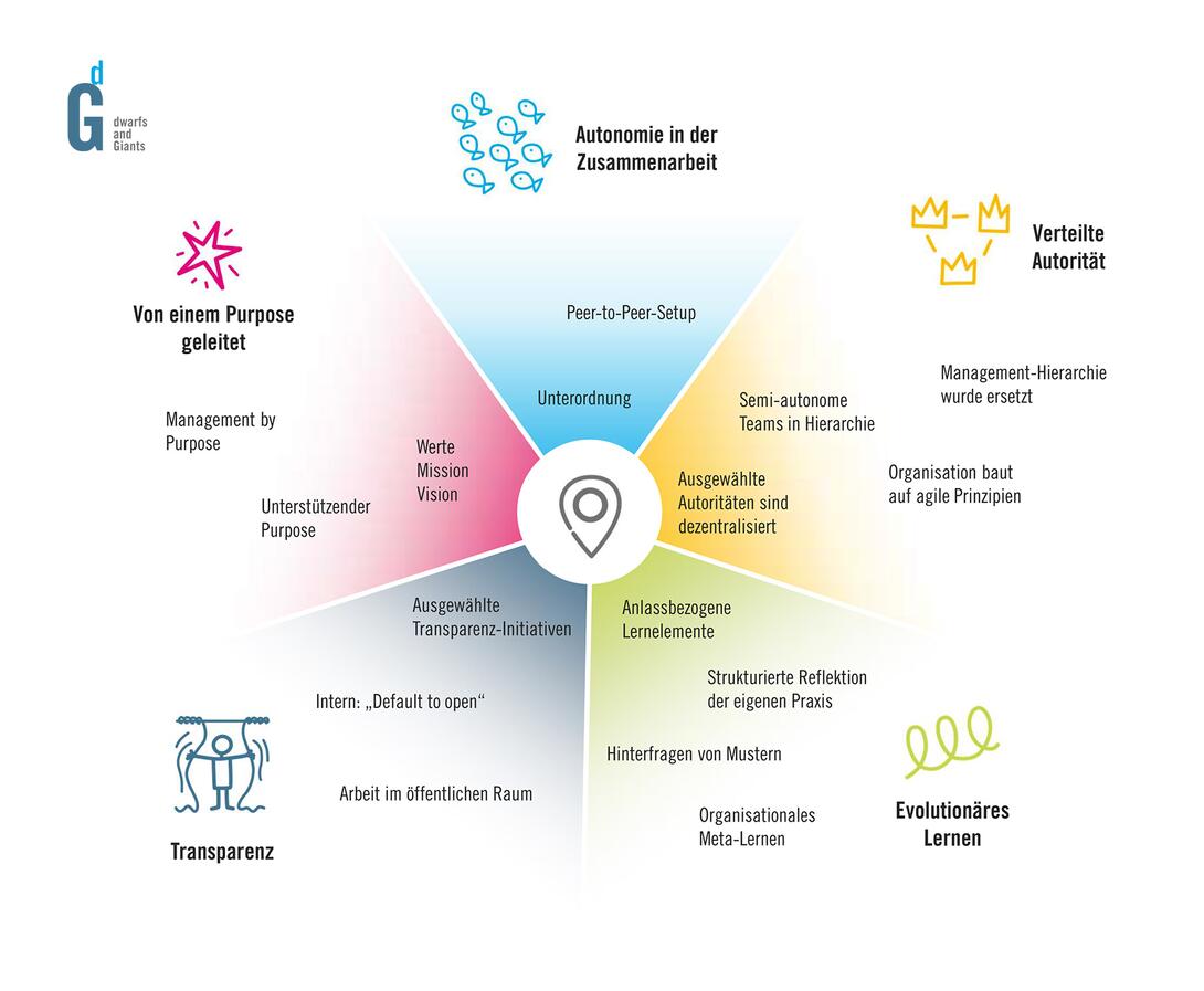 Herausforderungen: Autonome Zusammenarbeit setzt einen gemeinsamen Bezugspunkt (vgl. Purpose) sowie gemeinsam vereinbarte Regeln voraus, die für jedes Netzwerkmitglied bindend sind. Das Netzwerk ist als Kollektiv selbst für die Weiterentwicklung der Regeln verantwortlich. Kein/e MachthaberIn besitzt die Befugnis, eine Regel zu verändern, ohne die festgelegten Schritte zu befolgen. Dies verlangt effiziente und klare Entscheidungsfindungsprozesse.