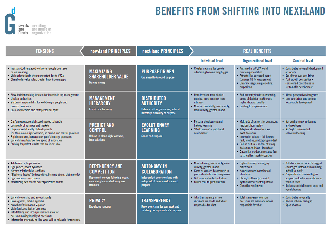 We believe in a land, where organizations and people are driven by purpose, authority is distributed, organizations adapt continuously by evolutionary learning, leverage autonomous collaboration, and share information transparently. And moving into next:land means bringing these five fundamental qualities into life.