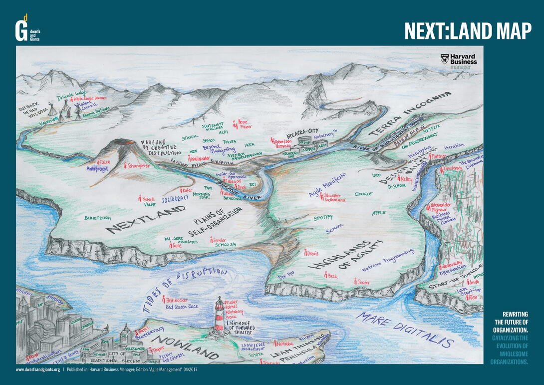 Knowing how overwhelming it can be to try to find the “right” New Work method, in 2016 we created the first edition of the next:land map. This map was subsequently published in the Harvard Business Manager (find out more in this English translation of the original publication) and is still used by many different organizations today to figure out in which direction they want to develop their organization.